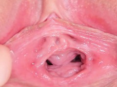 Sweet girl is gaping tight muff in close-up and climaxing